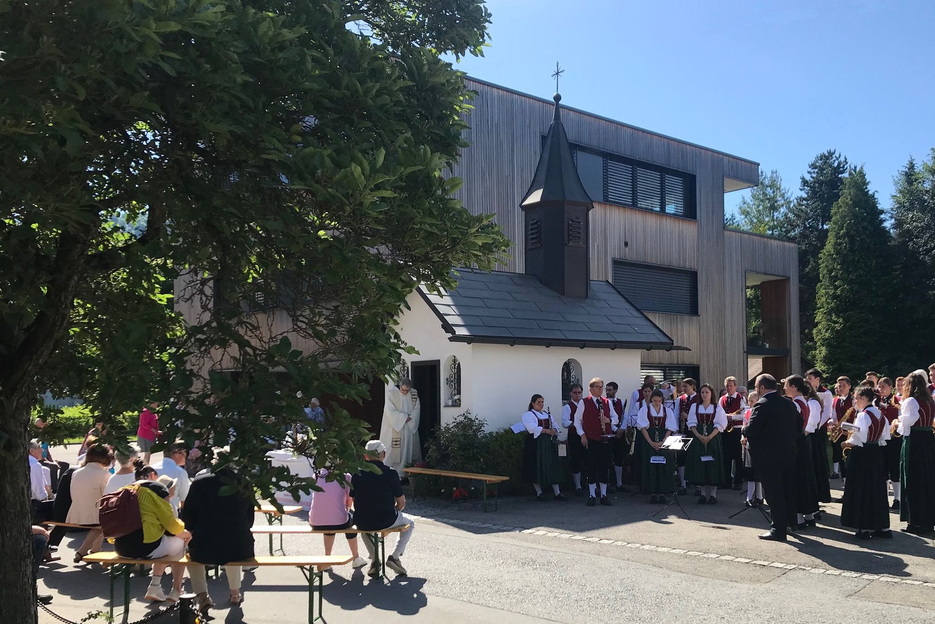 Die Fronhoferkapelle wird erstmals 1804 in einer Kapellenordnung erwähnt, die festlegt, zu welchen Anlässen und wann das kleine Glöcklein geläutet werden musste. Nach heutigem Wissensstand war das „Kappele" zweimal total baufällig und wurde immer wieder geringfügig versetzt, den bestehenden dritten Bau haben die Fronhofer aus eigenen Kräften 1976 bewerkstelligt. Im Inneren steht ein kleines, barockes Hausaltär-chen mit einem Bildnis der Muttergottes mit dem Kinde, flankiert von zwei kleinen Kapuzinerstatuen auf Postamenten. Jeweils am Sonntag vor Fronleichnam wird mit einer hl. Messe und einem gemütlichen Ausklang Dreifaltigkeits-Patrozinium gefeiert. |