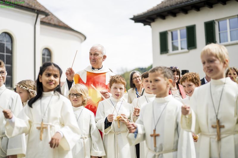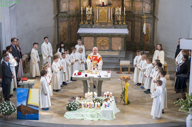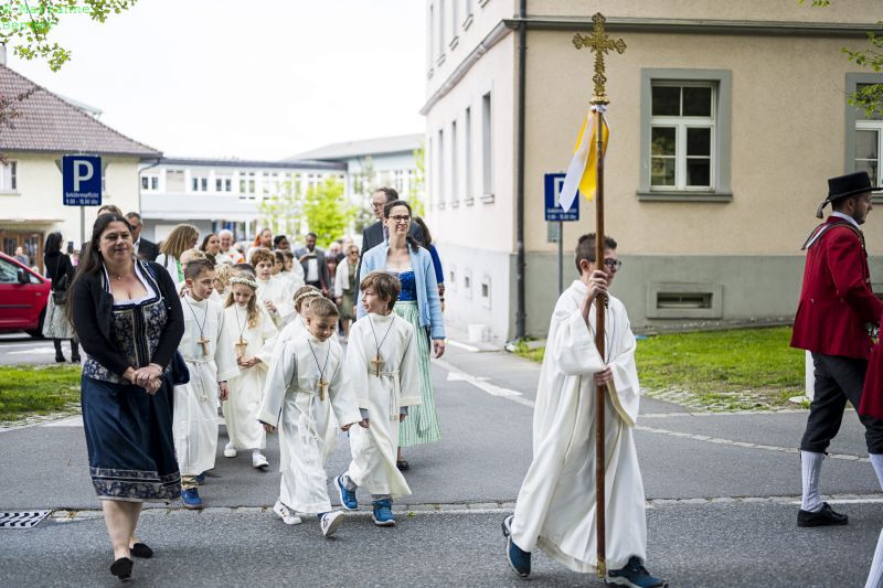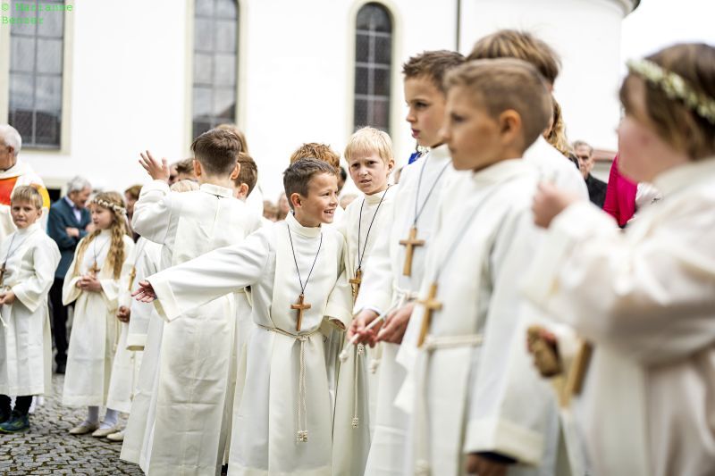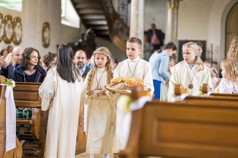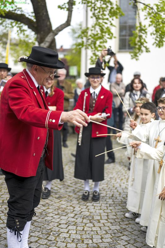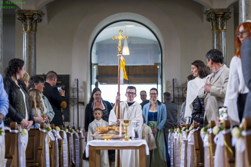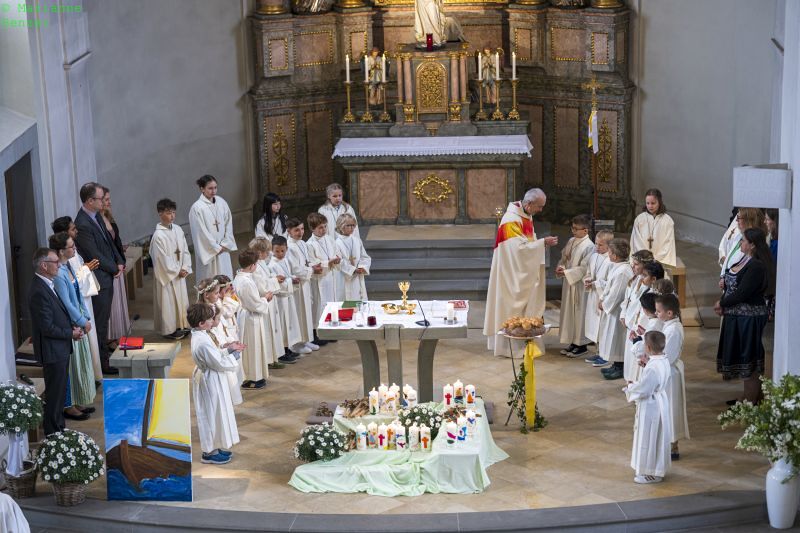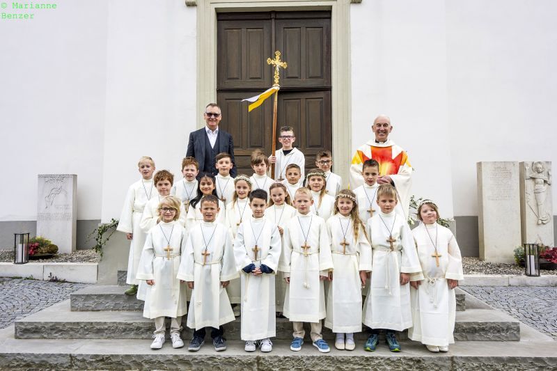 19 Kinder und ihre Angehörigen erlebten am 28. April in unserer Pfarrkirche eine beeindruckende Erstkommunion mit Pfarrprovisor Paul Burtscher und Gemeindeleiter Edgar Ferchl-Blum unter feierlicher Begleitung des Musikvereines Lochau.