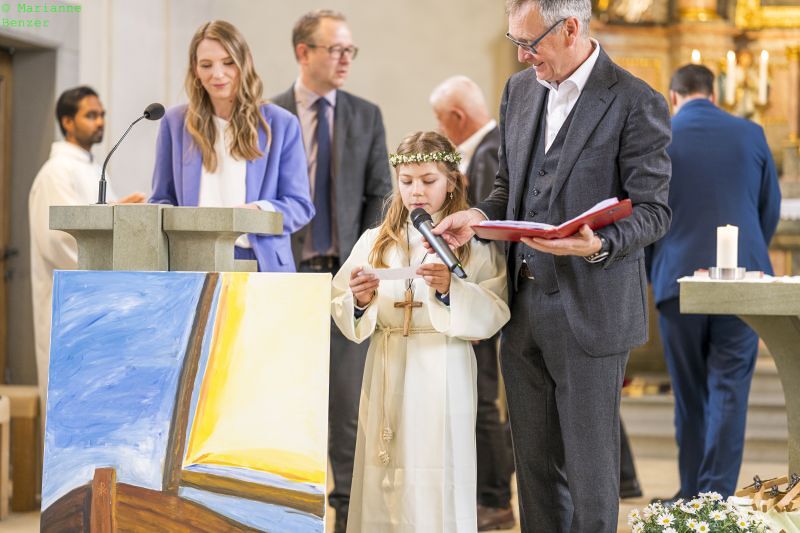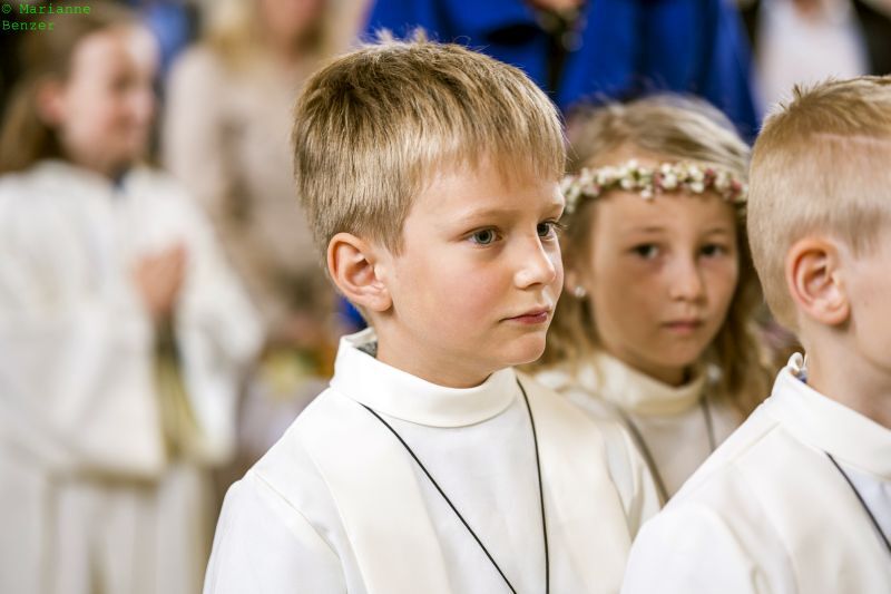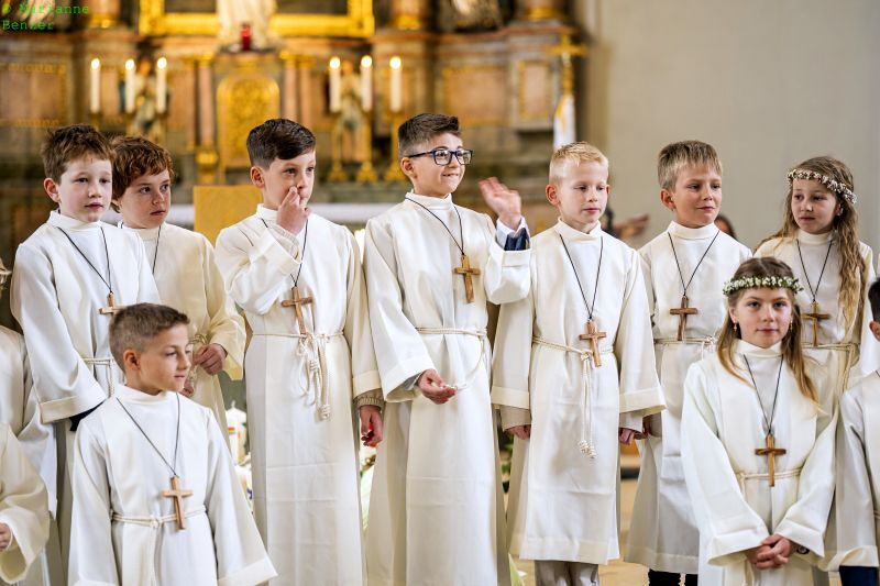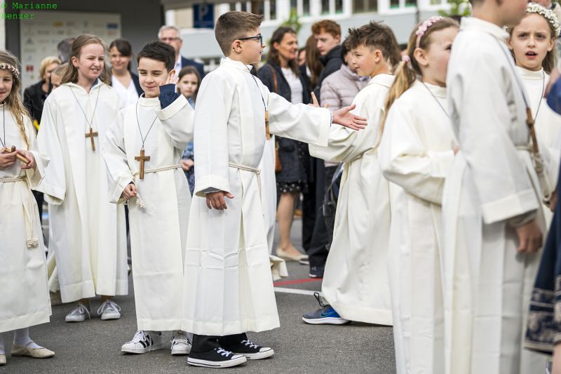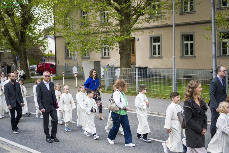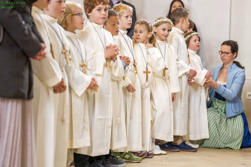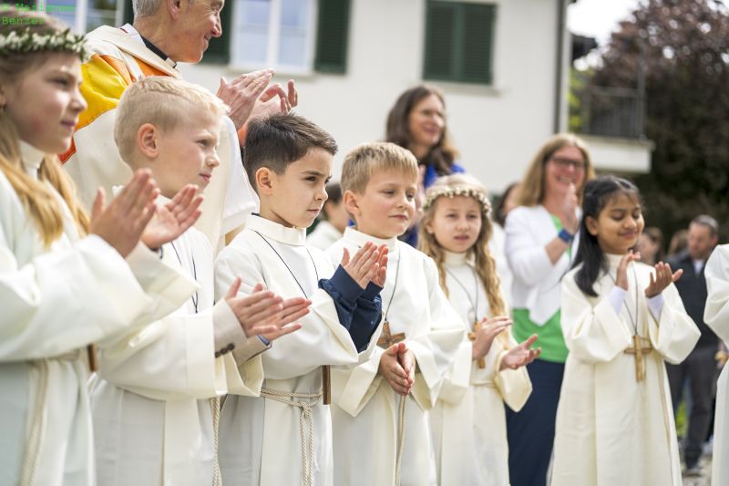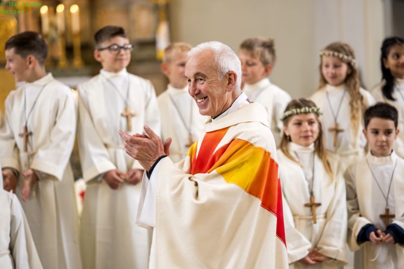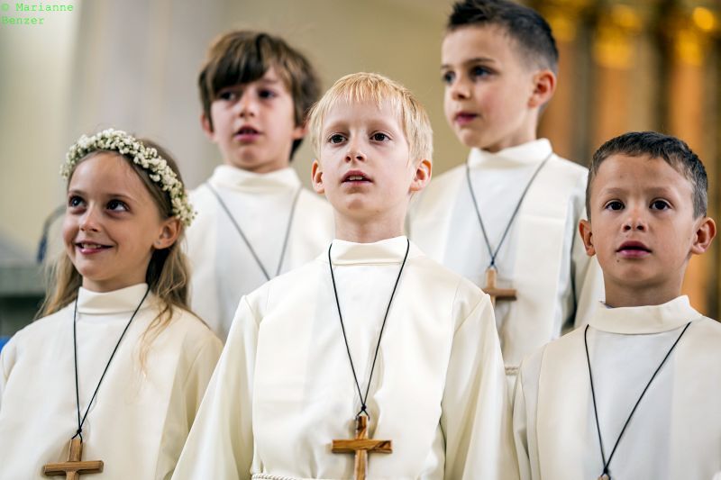 19 Kinder und ihre Angehörigen erlebten am 28. April in unserer Pfarrkirche eine beeindruckende Erstkommunion mit Pfarrprovisor Paul Burtscher und Gemeindeleiter Edgar Ferchl-Blum unter feierlicher Begleitung des Musikvereines Lochau.
