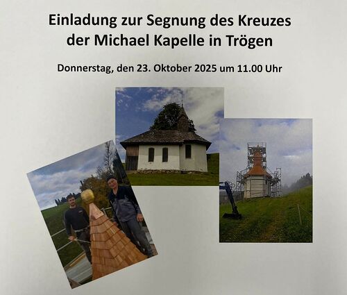 Einladung zur Segnung des Kreuzes der Michael Kapelle in Trögen Anlässlich der Fertigstellung der Dachsanierung der Michael Kapelle laden wir alle zur Segnung des Kreuzes und seiner... Mehr lesen